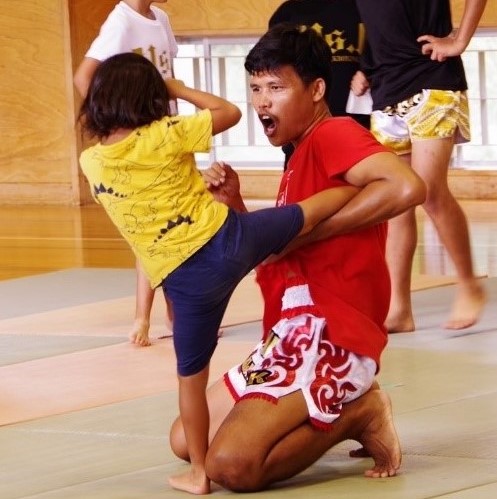 子供にムエタイを指導するポーナイさん