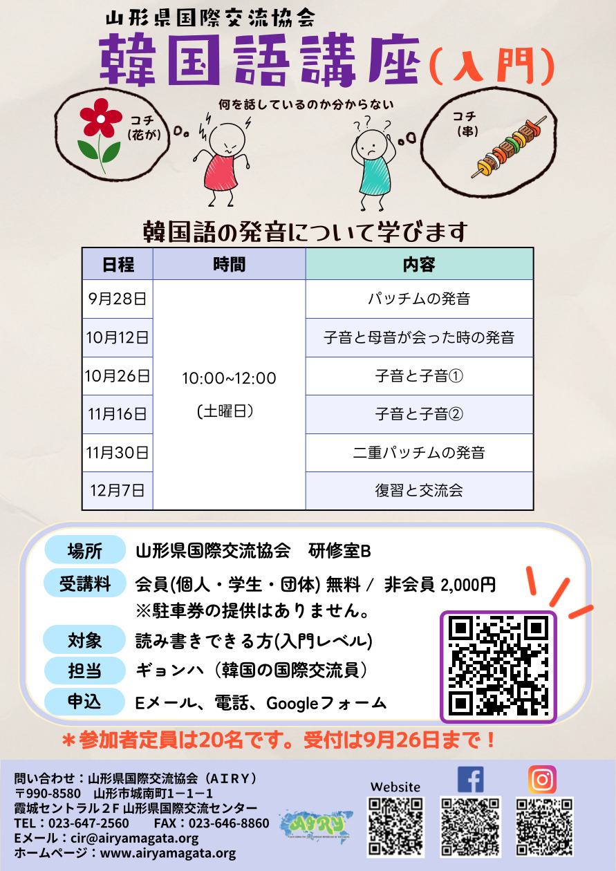 大変お待たせ致しました。R6年9~12月の韓国語講座(入門コース)のお知らせです。