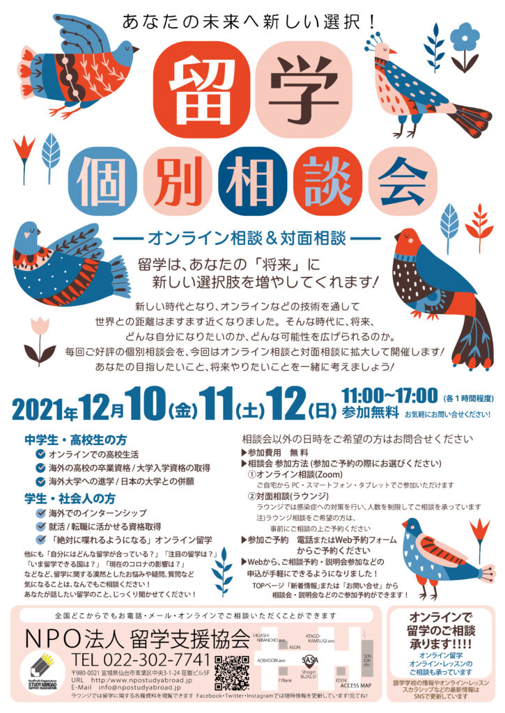 【NPO法人留学支援協会】12月留学個別相談会のご案内