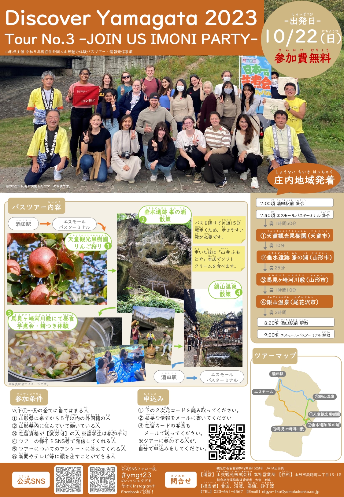 【Thông báo từ tỉnh Yamagata】Bus Tour trải nghiệm hấp dẫn dành cho người nước ngoài đang sinh sống tại Yamagataー”Discover Yamagata 2023″🚌Khởi hành ngày 10/22(CN)🚌🚌🚌🚌🚌🚌