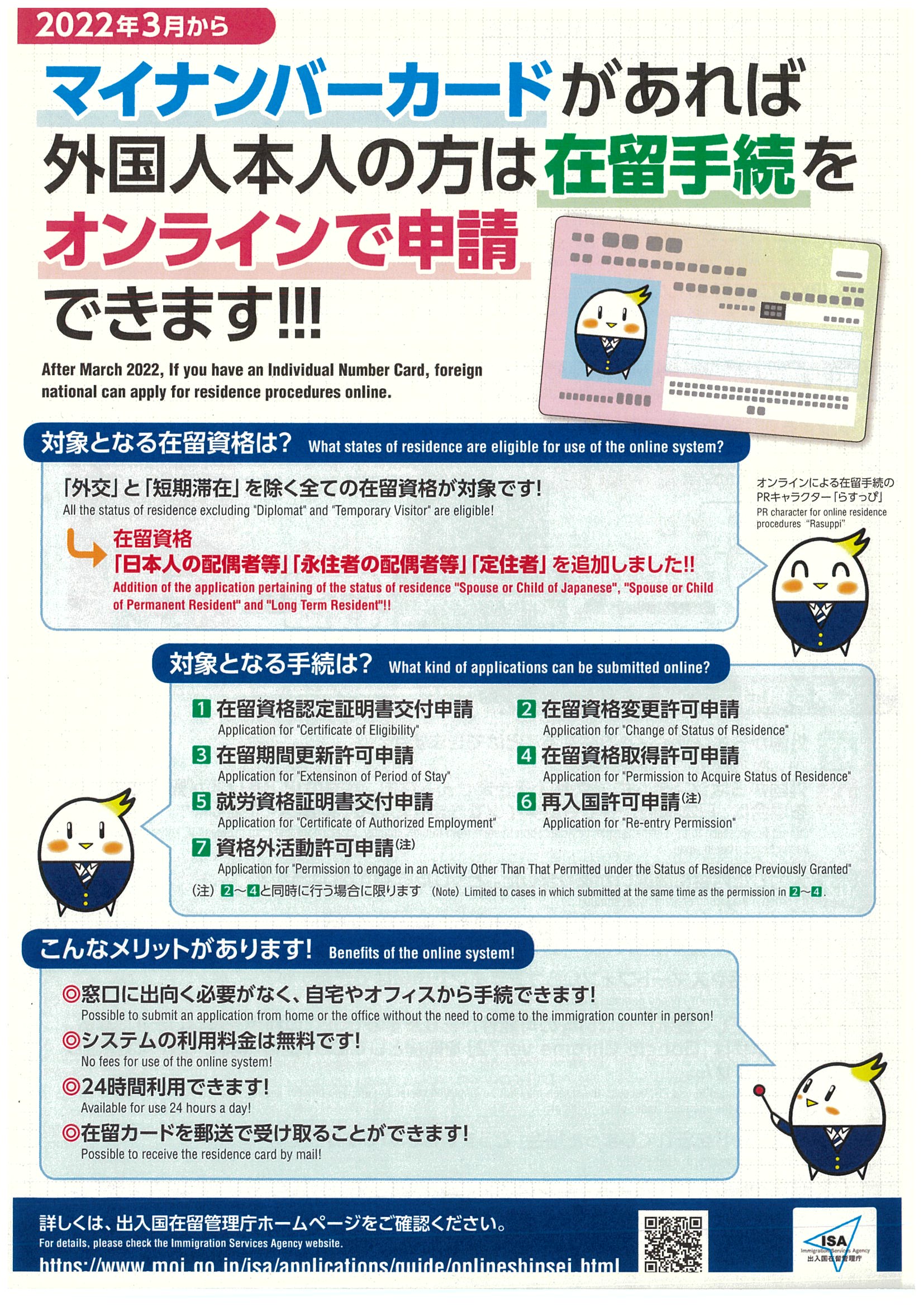2022年3月からマイナンバーカードがあれば、外国人本人は在留手続きをオンラインで申請できます!!!