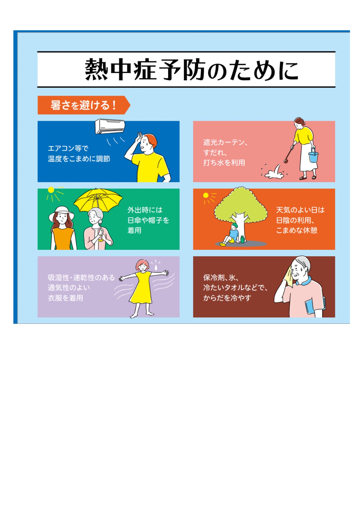 熱中症について正しい知識を身につけ、体調の変化に気をつけるとともに、 周囲にも気を配り、熱中症による健康被害を防ぎましょう。