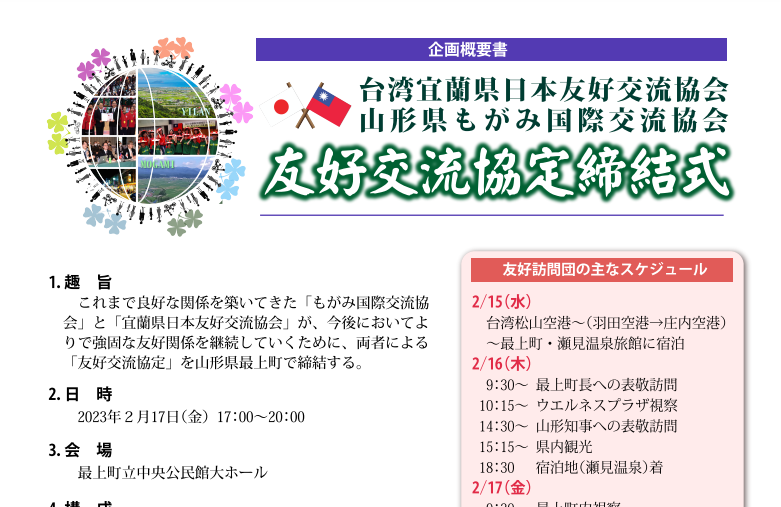 (もがみ国際交流協会からのお知らせ)台湾の宜蘭県日本友好協会と友好交流協定締結式を行います 2月15日~19日