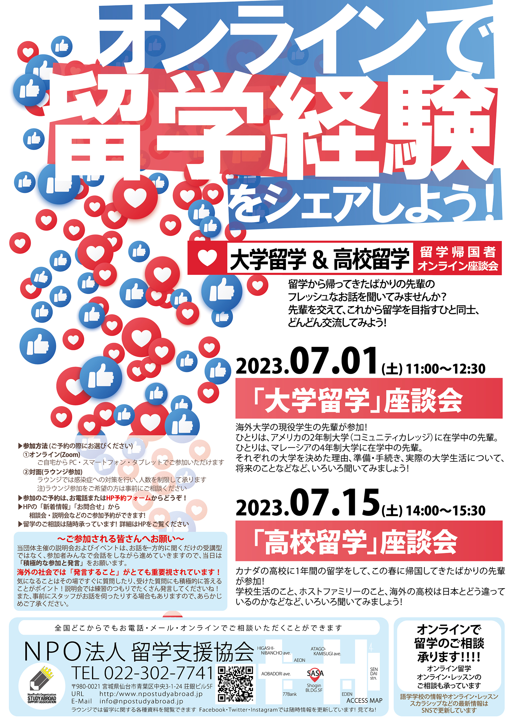 (NPO法人留学支援協会からのお知らせ)7月開催「大学留学&高校留学帰国者オンライン座談会」のご案内
