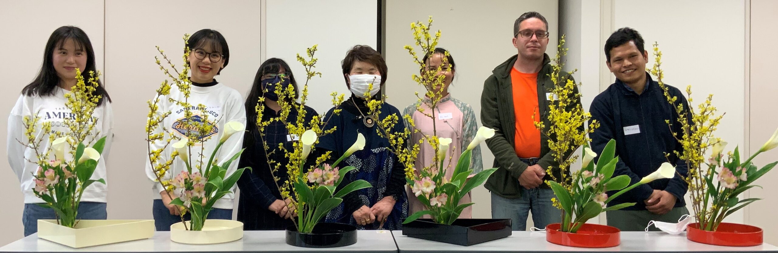 最初に生け花の基本的な知識を学んだ後、レンギョウ、カラー、アルストロメリアなどを花材として、生け花を楽しみながら日本文化の理解を深めました。