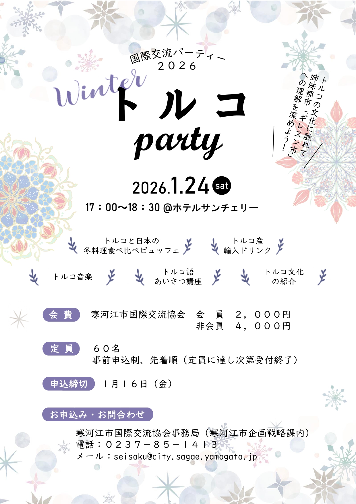 【寒河江市国際交流協会からのお知らせ】 Winterトルコパーティー ~トルコの文化に触れて姉妹都市「ギレスン市」への理解を深めよう!~