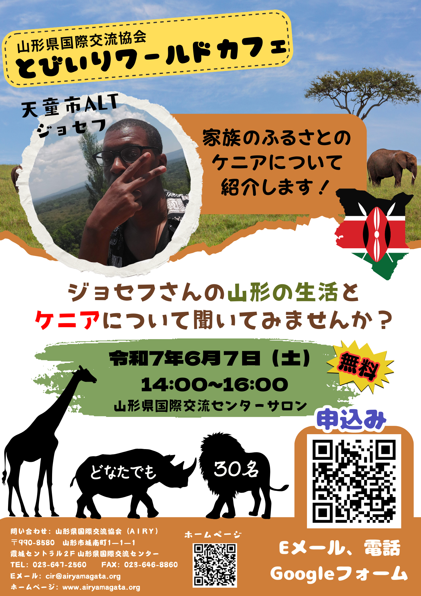 6月7日(土)のとびいりワールドカフェでは、天童市のALTであるジョセフさんをご紹介します。また、ジョセフさんのご家族の故郷である「ケニア」につい🐒てもご紹介する予定です。🦒🦁🐒