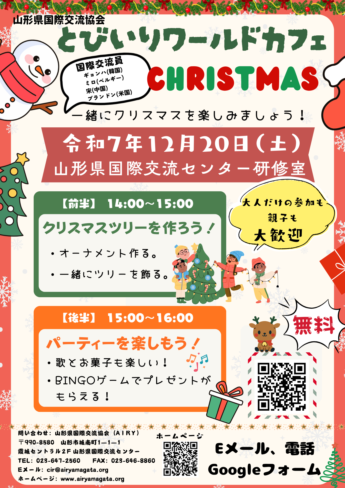 12月20日(土)14:00~16:00にとびいりワールドカフェでクリスマスパーティーを実施します。🎄
