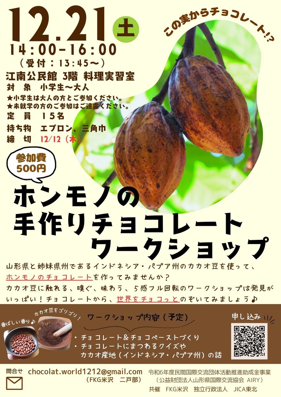 山形県と姉妹県州であるインドネシア・パプア州のカカオ豆を使って、ホンモノのチョコレートを作ってみませんか?