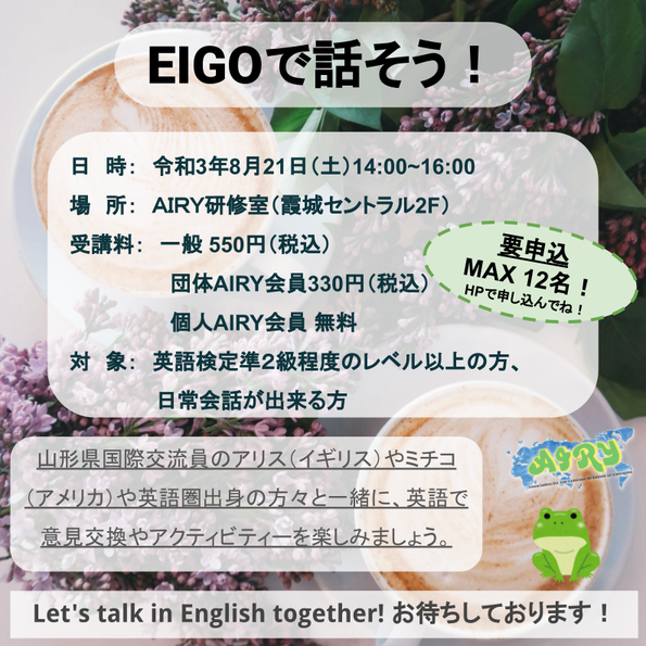 8月「EIGOで話そう!」のお知らせです!コロナウイルス感染症拡大対策のために、午後の部のみ開催します!12名しか参加できないために、公平に参加者を決めたいと思って、今後の申込は抽選で決めさせていただきます。