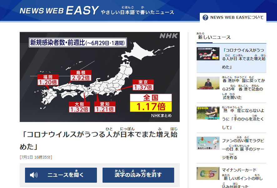 NHK 「NEWS WEB EASY」やさしい日本語で書いたニュース 「コロナウイルスが うつる人が 日本で また増え始めた」