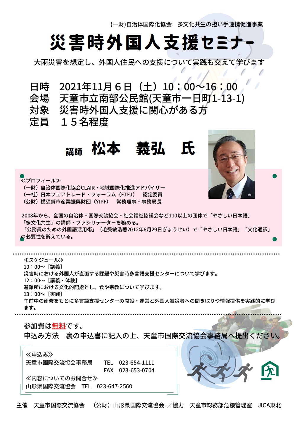 2021年11月6日 土曜日 天童市立天童南部公民館を会場に「災害時外国人支援セミナー」を開催し、支援者、外国人住民21名が参加しました。